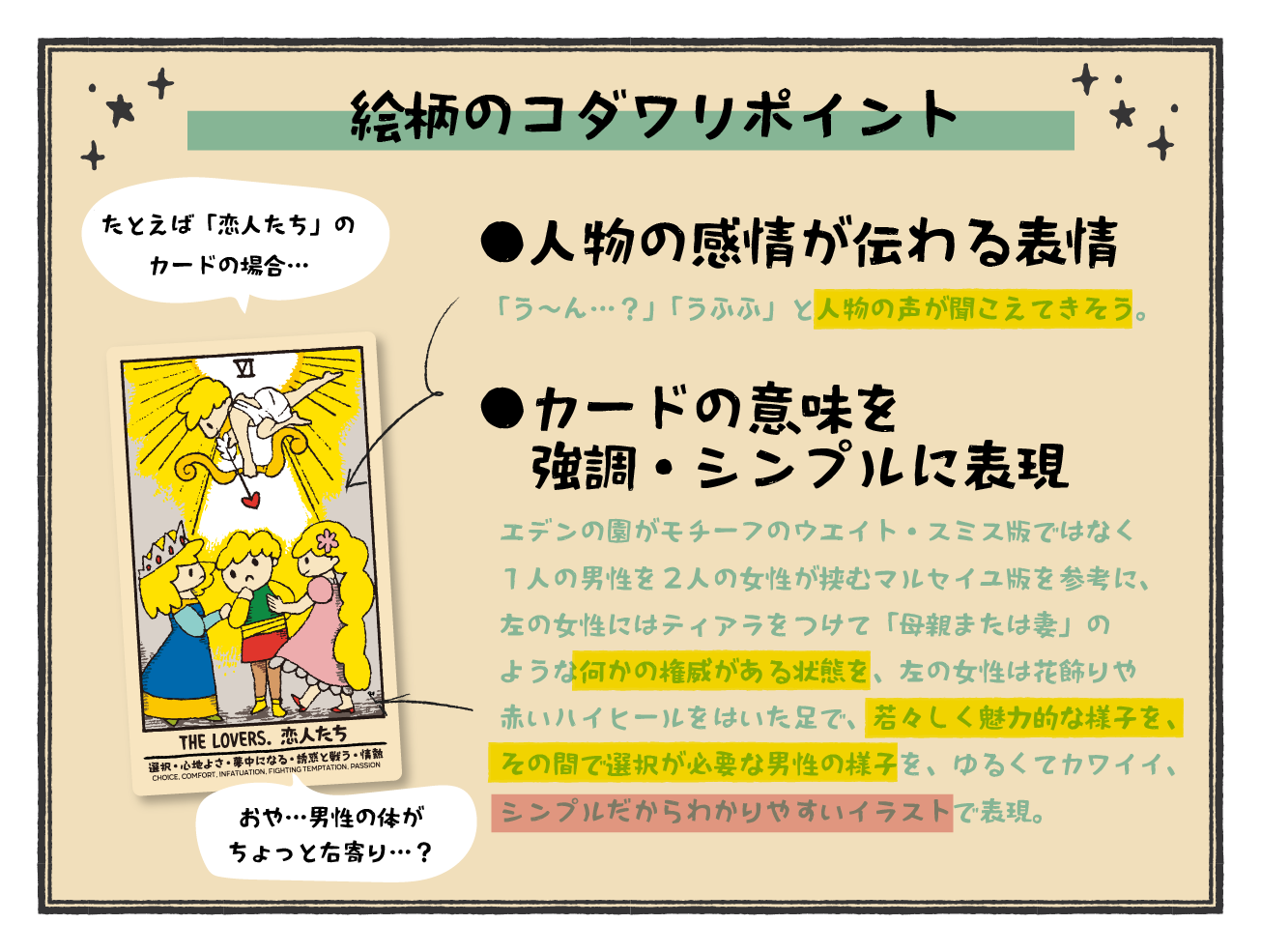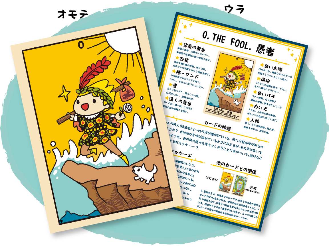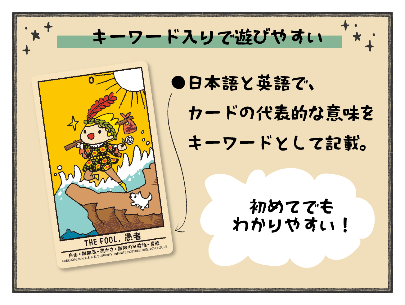 カードの代表的な意味がキーワードとして記載され、絵柄もゆるくシンプルだからこそ意味がわかりやすくなるように制作されたオリジナルタロットカード。
