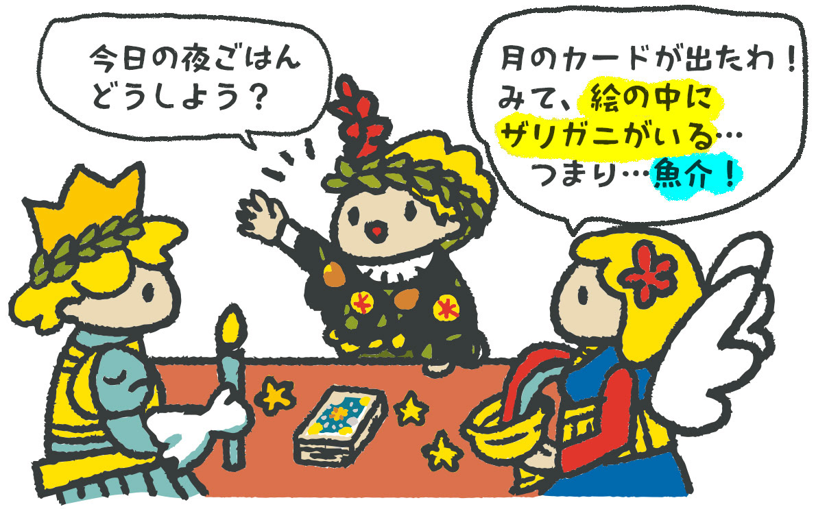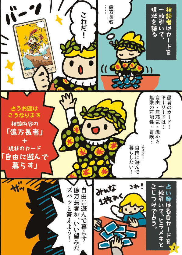 遊び方はカンタン。1人は相談者、そのほかの人は占い師になり、タロットカードを引いて、カードからインスピレーションを得たり、キーワードや絵柄にこじつけたりして占いましょう。